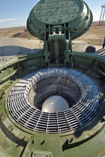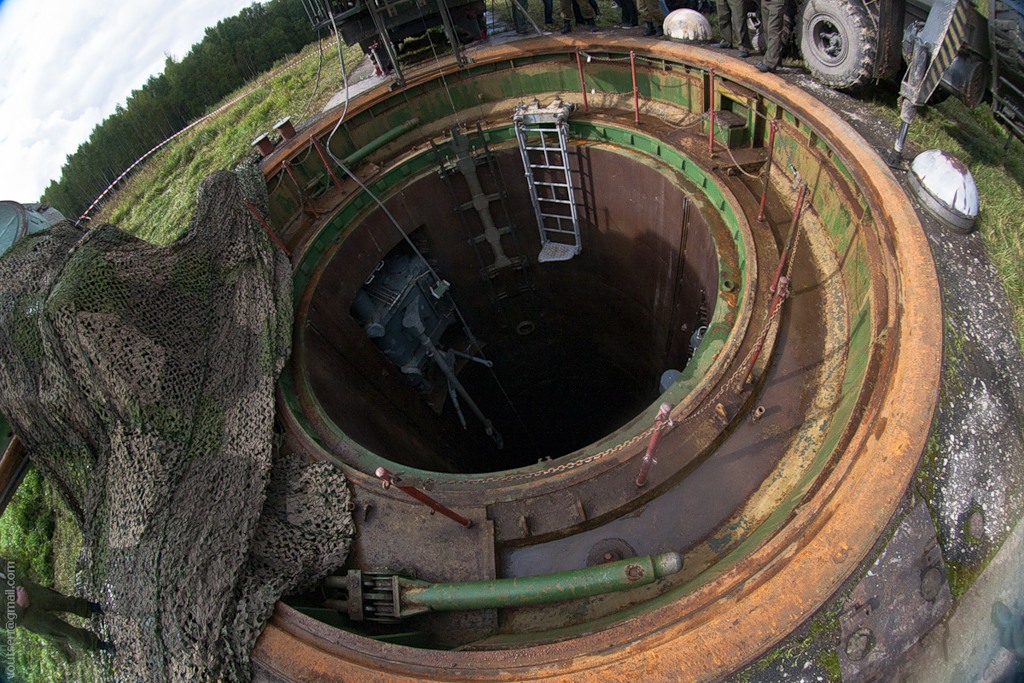 В предыдущем посте на 2 фото ШПУ 15П765 высокой защищённости от поражающих факторов ядерного взрыва (ПФЯВ) боевого ракетного комплекса (БРК) 15П035 с межконтинентальной баллистической ракетой (МБР) 15А35 (УР-100Н УТТХ). Крыша защитного устройства (ЗУ) открыта, видимо, для регламентных работ. МБР в ШПУ постоянно находится в транспортно-пусковом контейнере (ТПК), который сверху закрыт специальной сбрасываемой мембраной. В таком положении ТПК с ракетой герметичен и в нём находится осушеная газовая среда. В данном случае мембрана снята, поэтому видно головную часть (ГЧ) ракеты.
