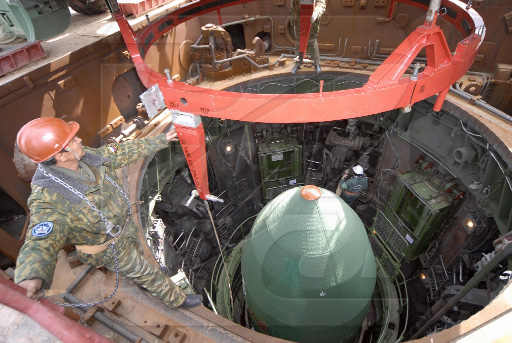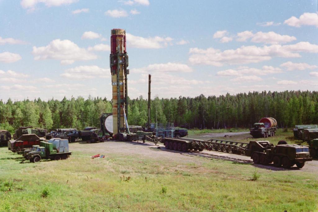 3. ТПК с МБР в ШПУ. Сверху ТПК закрыт герметичной мембраной белого цвета. В проём между внутренними стенками ШПУ и ТПК установлены четыре технологические лестницы.
