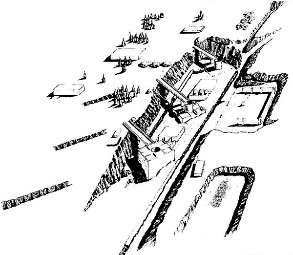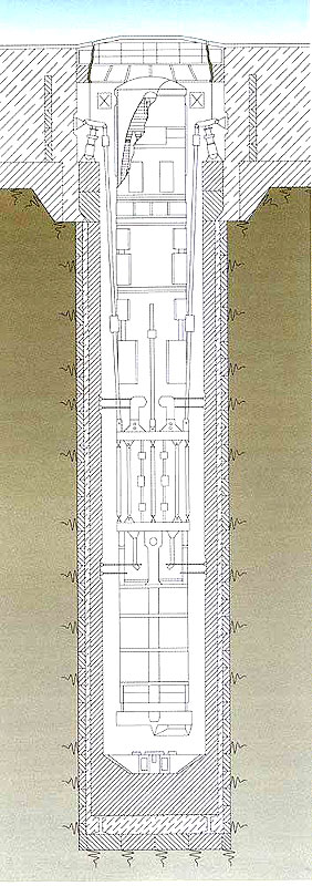 Дак вот, вся эта красота строилась открытым способом. Т.е. отрывалось несколько котлованов (например, в районе ШПУ и хранилищ КРТ, в районе КП) и уже в них строились эти сооружения и потерны. Шахты, безусловно, строились методом проходки, но квадратные двухуровневые оголовки ШПУ - открытым способом (о чём и свидетельствует приведёный Вами рисунок)... Размеры основного котлована были просто огромными.
