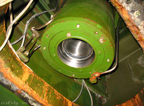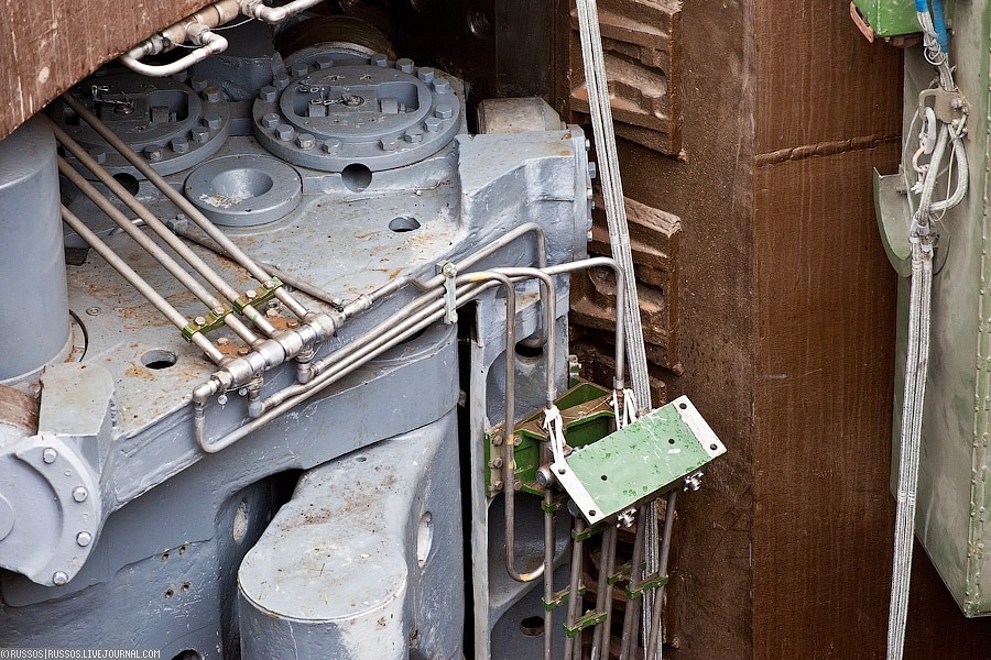 При регламентных работах крыша, ЗУ, откидывали, точнее будет открывали, при помощи агрегата 15Т191 (могу ошибиться). Процесс этот достаточно долгий, до вертикального положения ее поднимали минут 20. При боевом откидывании (насколько мне известно), до вертикального положения она должна была дойти за 7 секунд и потом за 4 секунды опускаться на гидротормозах до угла 135 градусов. Была где-то реплика об очень быстром подъеме ЗУ при регламенте. ЗУ поднимается при помощи т.н. газогидравлического движителя, ГГД. А при боевом она отстреливается при помощи ПАД (пороховой аккумулятор давления), у нас просто пиропатрон. Пиропатрон устанавливаентся в полость ГГД при постановке ШПУ на боевое дежурство. На снимке ГГД и место установки пиропатрона ...