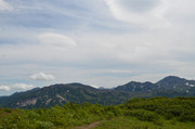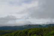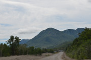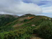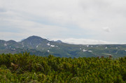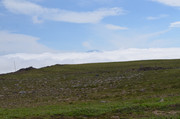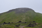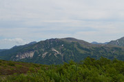 Идем дальше. Тропа на Горелый обозначена воткнутыми белыми полипропиленовыми трубами, так что заблудиться здесь трудно. Подъем то положе, то круче, то приходится идти по большим камням, как по ступеням. На этой фотке вдали - самая высокая точка Горелого - 1829 метров. А базовый лагерь находится на высоте примерно 1000 м, так что подниматься не так уж и много. Но всё равно тяжело с непривычки и с моим лишним весом.