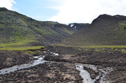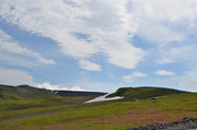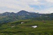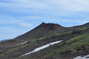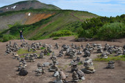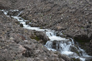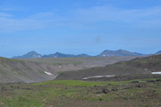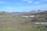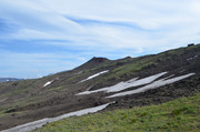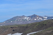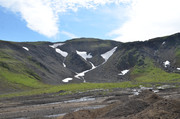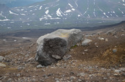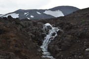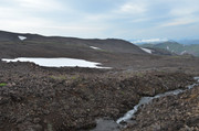 Постепенно с подъёмом зелень пропадает, вокруг камни - застывшая лава. Всё больше снежников, из которых, естественно, текут ручьи. В кадр попадают конусы, образовавшиеся в ходе относительно недавних извержений Горелого. Да, мы на действующем вулкане. Не поленитесь, почитайте про Горелый, например,