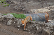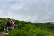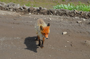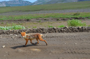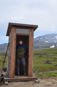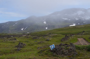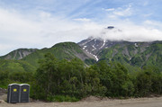 стукачи инспекторы, фиксирующие парковку не там, где можно, только здесь нельзя оставлять машину на скудной тундровой растительности, а на камнях, лаве и песке - можно. На стоянке несколько десятков машин, в основном повышенной проходимости, но замечена и обычная городская моноприводная - что-то вроде НЕссан-Микры. Смогла доехать. Поодаль стоят палатки, везде развернуты походные столы с дальневосточными деликатесами - но это не буфеты для всех желающих. Это обеды, которыми своих туристов обеспечивают местные гиды. Кроме рыбы и морепродуктов, на столах замечены даже арбузы и виноград. При стоимости однодневной экскурсии на Горелый в 10 - 15 тысяч рублей за одного туриста вполне можно его порадовать хорошей едой, а арбуз после утомительного подъёма вернет потерянную влагу и восстановит силы. Да, базовый лагерь оборудован тремя туалетами типа сортир, такими же, как у стоянки у лавовых пещер в кальдере, где мы уже побывали. Но заметно грязнее.