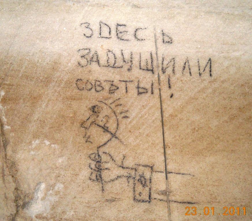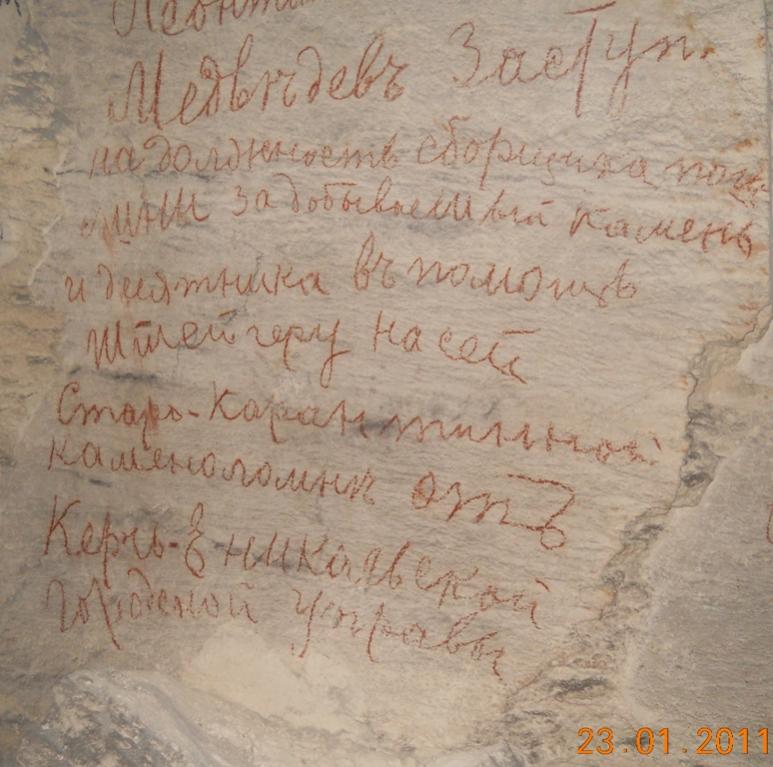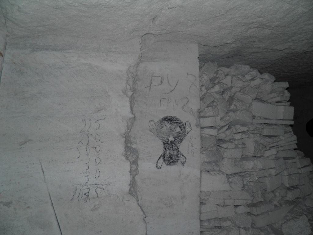 Интересно но Этой надписи я нигде не видел, это говорится про ту часть, что за трубами сразу или перед ними , а по поводу названия Старокарантинские Это каменоломни находящиеся возле поселка Старый Карантин и объединяют несколько разных выработок сбитых между собой. Существующий вариант входов был до войны одним, после войны другим, а сейчас третий и у каждой из этих каменоломен есть свое название( Рабочка, Матроска, Гелка,Жучка, Лисичка) сейчас некоторые дают им свои названия (Помидорная) например. Вполне вероятно, что через третий самый нижний этаж были проходы уж очень она похожа на каменоломни идущие следом .Уже ответил в воздух, второй раз короче - есть надпись в выработке, она названа прямо - "Старокарантинная каменоломня". Сейчас её могут называть как угодно, но в 1910 было так. Следов боёв нет. (Не помню, что бы видел...)