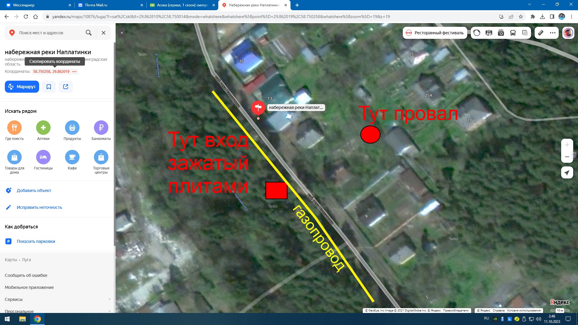 Из перспектив: провал на участке, вместе с участком пренадлежит "своему человеку" (Александр Ефставьев. https://vk.com/id652106867), у него в провал стекает вода с грядок, а его отец ветеран и копатель, и сам он тоже копал военные штуки. Тоннель кст. тупо глазами видно с земли. Но там щель узкая, не пролезть. Домкрату завал не поддаётся, однако видно, что длина завала невелика, а за ним тянется прямой и длинный ход.