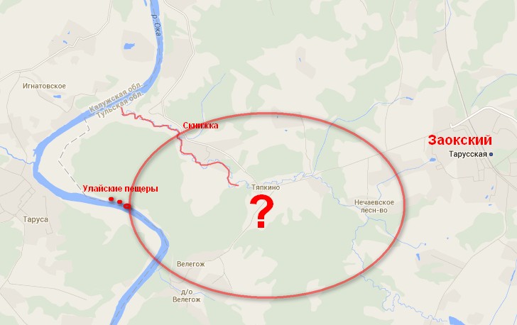 Город Заокский (мож Село, точно ХЗ, находится южнее серпухова километров на 20 по ЖД ветке), от заокского километров 15 на запад. Фактически - на другом береку Оки относительно тарусы и на несколько км вглубь от берега.